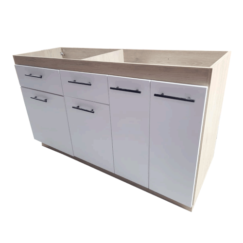Mueble Inferior Belmira Rovere y Blanco 150 cm. Gabinete Inferior, con 4 puertas batientes, 2 cajones, manijas metálicas. No incluye el fregadero (mesón) [ ...ver más ]